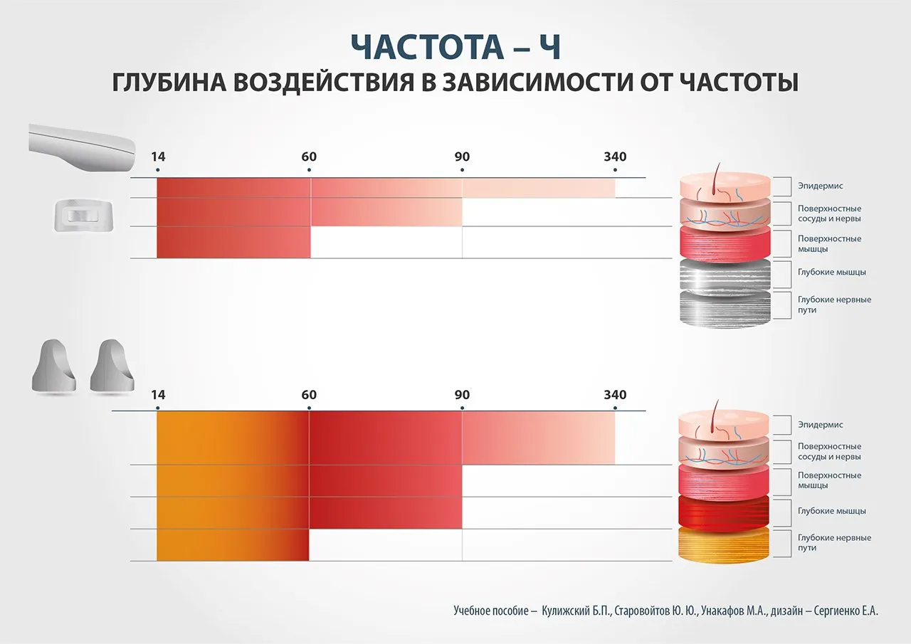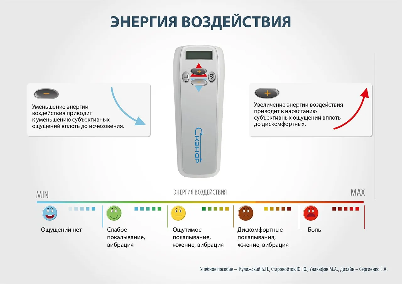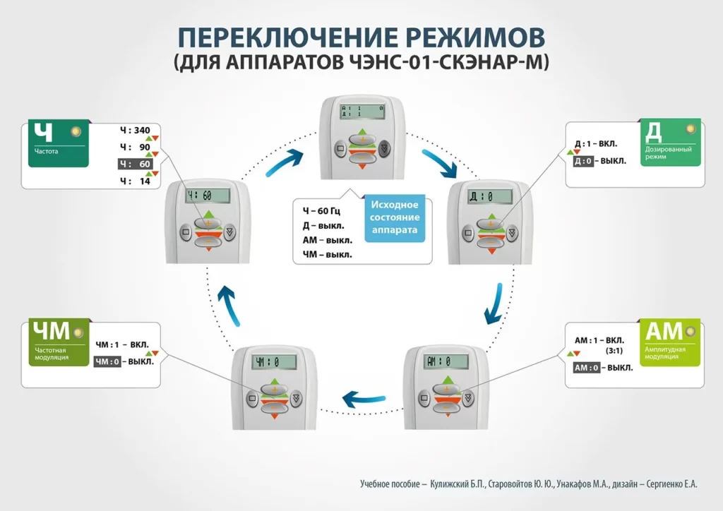 В нем запрограммирован один вид диагностики, пять режимов воздействия, а также расширен диапазон частот. Частота 340 Гц — наилучшим образом подходит для обезболивания. Наиболее эффективна при эстетической обработке кожи лица. Частота 14 Гц — наиболее благоприятна в начале курса лечения хронических заболеваний. Также используется при работе с детьми. Частоты 60 и 90 Гц — стандартные, они постоянно используются в методиках СКЭНАР-терапии и могут варьироваться.