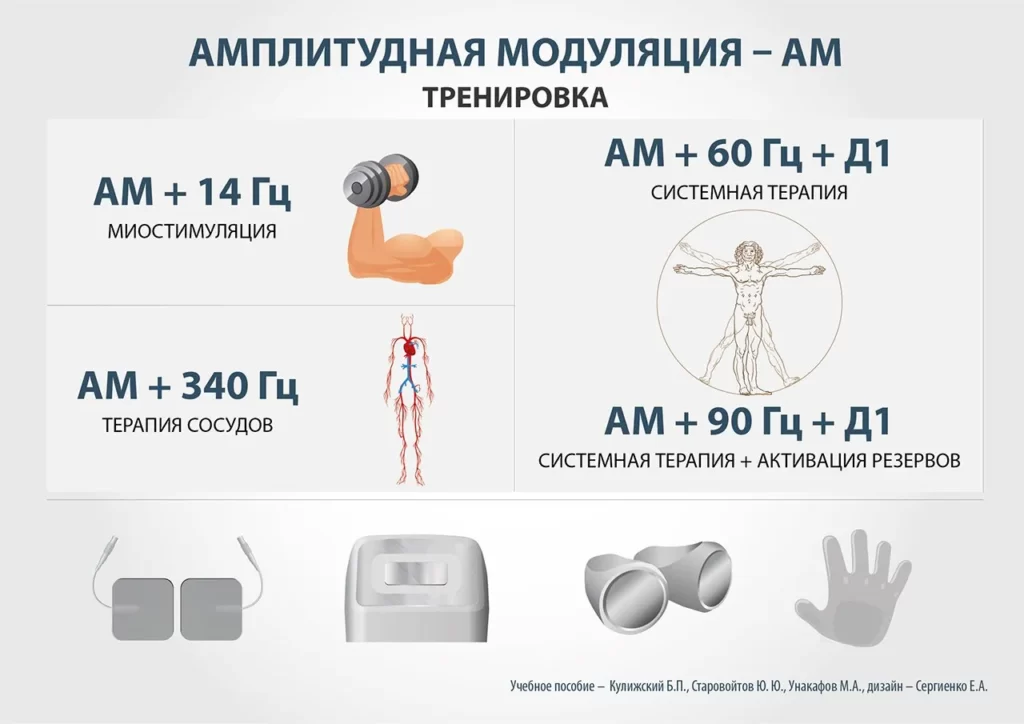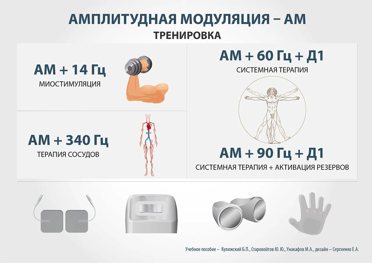 Эта модель позволяет одновременно подключать и работать в двух режимах. АМ и ЧМ, что усиливает и дополняет эффекты их воздействия при выполнении различных методик. Этот аппарат включает в себя еще два режима: Для проведения курсового лечения при хронических заболеваниях используют режим диагностический (объективно-дозированный) (Д). При отмене всех режимов включается постоянный режим воздействия (субъективно-дозированный), он рекомендован при острых состояниях.