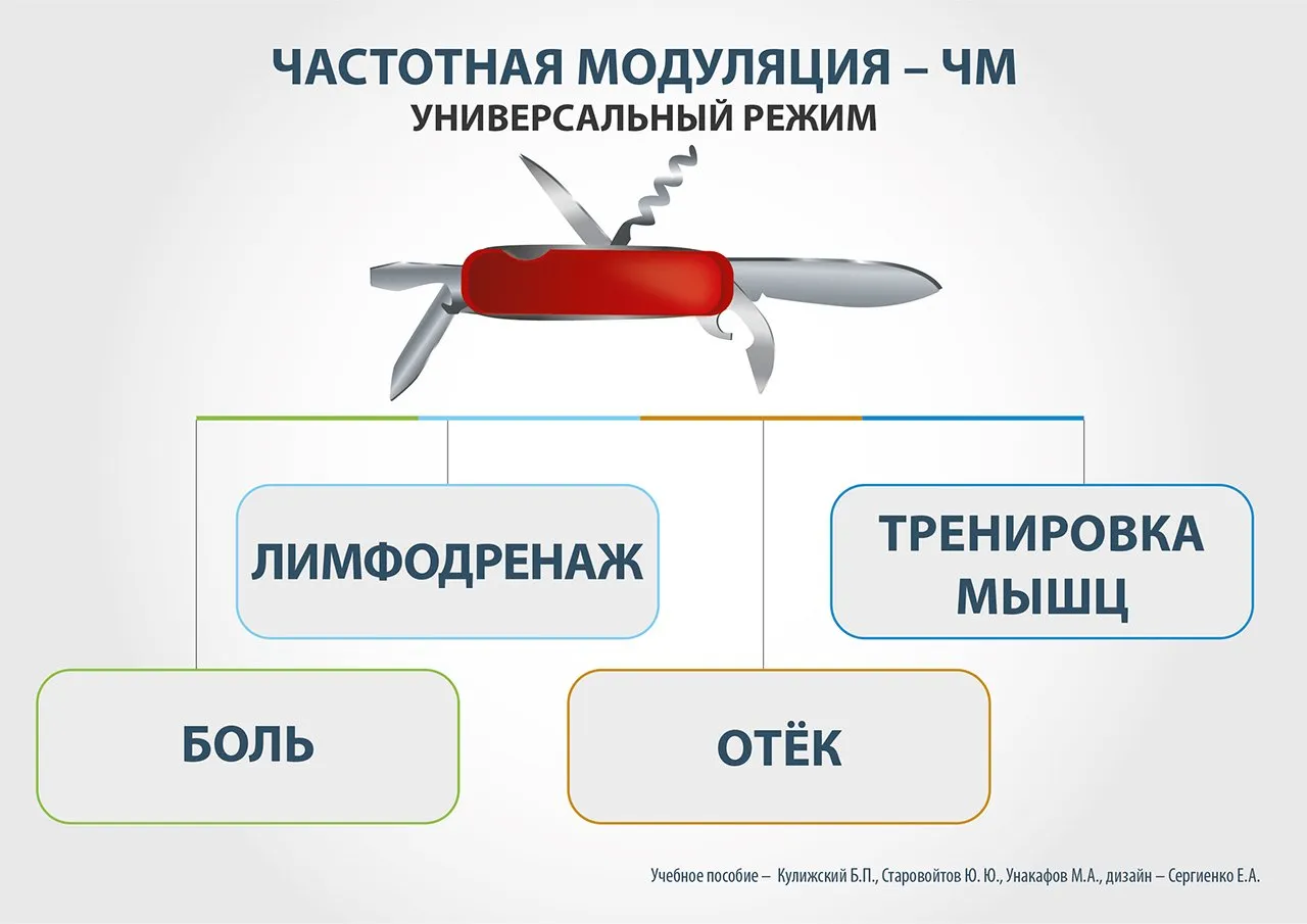 Рассмотрим применение режимов, заложенных в данной модели. Режим амплитудной модуляции (АМ) — стимулирует мышечные сокращения, что уменьшает отеки и усиливает кровообращение и лимфодренаж. В сочетании с низкими и высокими частотами (от 14 и не менее 340 Гц) эффективен в косметологии, при применении определенных методик. Режим «качающаяся» частота (ЧМ) — включает в себя непрерывный поток различных частот, что усиливает СКЭНАР-эффект в работе на активной зоне.